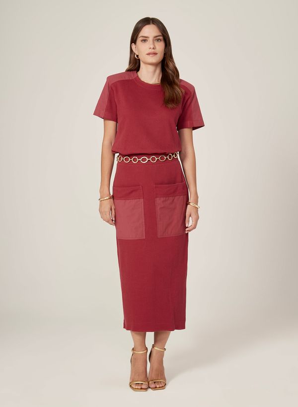 Confeccionada em tecido plano, a Saia possui modelagem Reta, comprimento midi, bolsos frontais, detalhe logo em meta e recorte posterior em fenda.