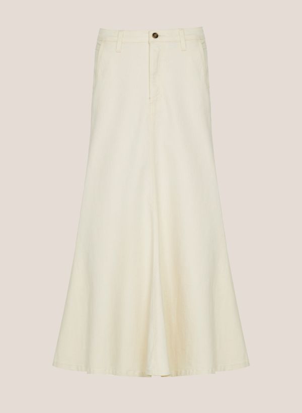 Cofeccionada em sarja, a saia possui comprimento Longo, cós com passante para cintos, bolsos frontais e posteriores, fechamento por zíper e botão e acabamento pespontado.