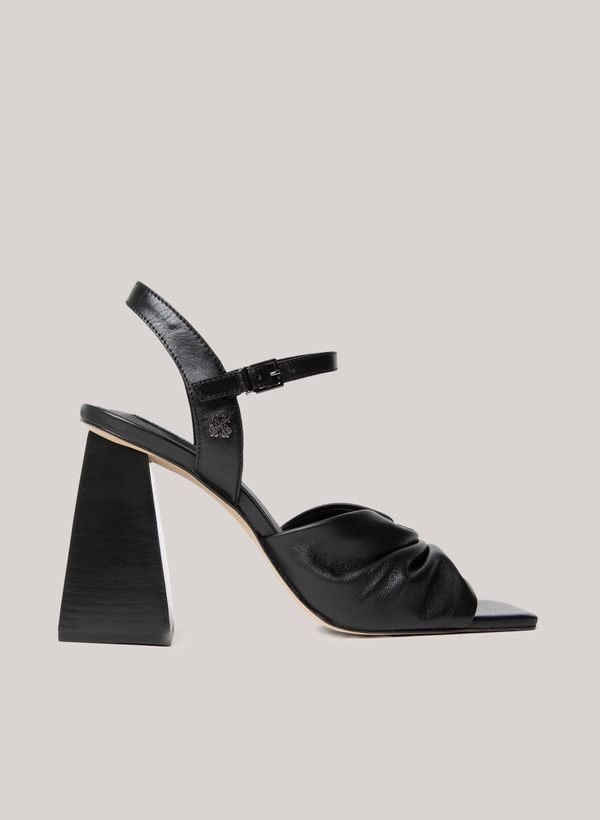 Produzida em couro, a Sandália possui salto de 10 cm com formato triangular, formato quadrado na ponta, detalhe de piercing e fechamento por fivela no tornozelo.