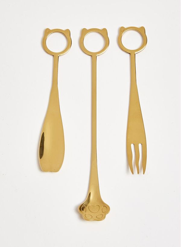 O Set de Talheres Animal é produzido em aço inoxidável com banho dourado. É composto por colher, garfo e bailarina com formato lúdico que remetem a animais.