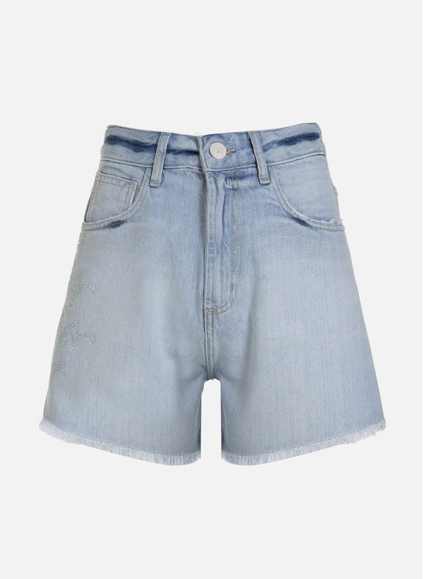 Confeccionado em jeans, o Shorts possui modelagem boy alto que se assenta na linha abaixo do umbigo, com gancho deslocado valorizando a silhueta e trazendo comforto, lateral levemente mais alto que entrepernas dando anatomia para a peça, cós com passantes, bolsos frontais e posteriores, hot fix transparente aplicado, fechamento frontal por zíper e botão, barra cortada a fio e acabamento pespontado.