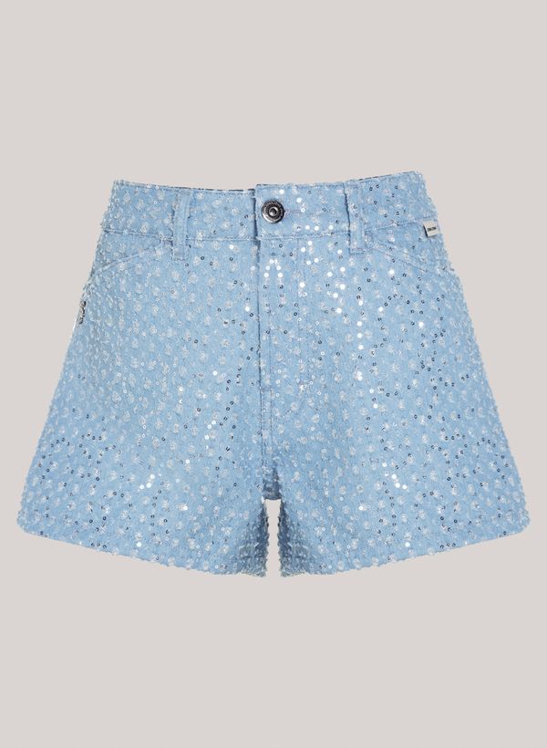 Confeccionado em jeans com paetê, o Shorts possui modelagem evasê, cós com passantes, bolsos frontais e posteriores, fechamento frontal por zíper e botão, etiqueta externa aplicada e acabamento pespontado.