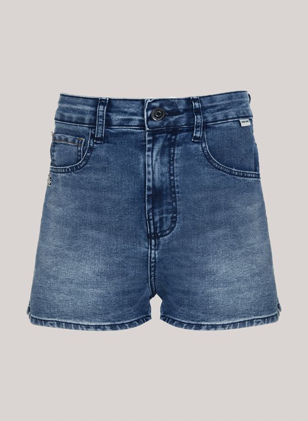 Confeccionado em jeans, o Shorts possui modelagem regular fit, cós com passantes, cinco bolsos, fechamento frontal por zíper e botão, etiqueta externa aplicada e acabamento pespontado.