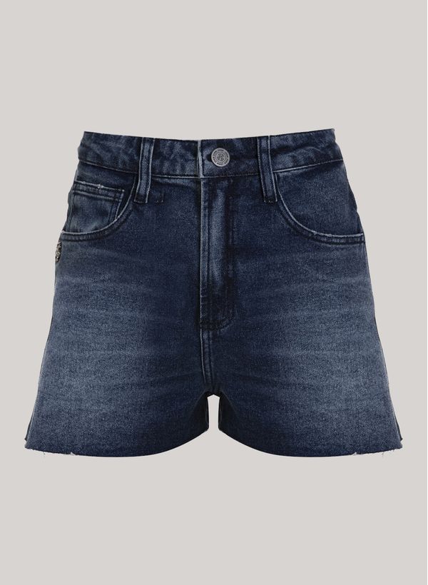 Confeccionado em jeans com lavagem média, o Shorts possui modelagem ajustada com o gancho encaixado, cintura e quadril ajustados, cós com passantes, cinco bolsos, fechamento frontal e acabamento pespontado.