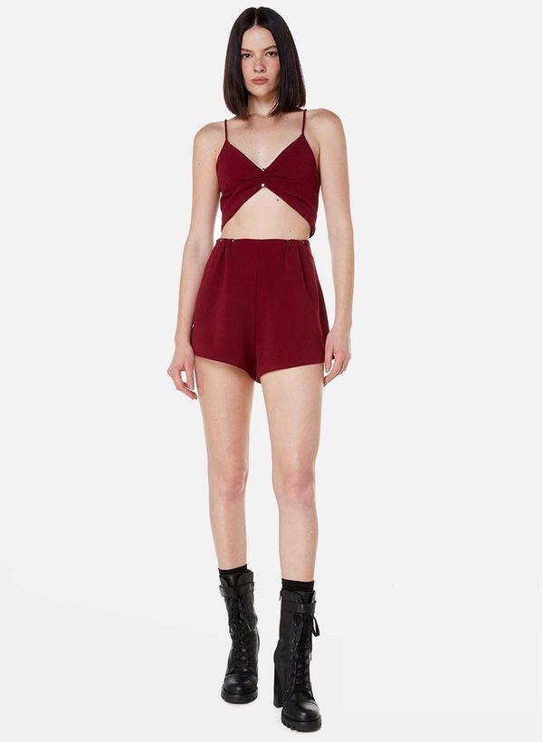 Confeccionada em tecido plano, o Shorts possui modelagem ampla em shape “A”, cintura alta, bolsos de alfaiataria posterior, detalhe de aplicação de percing metálico com franzido frontal e fechamento por zíper invisível lateral.