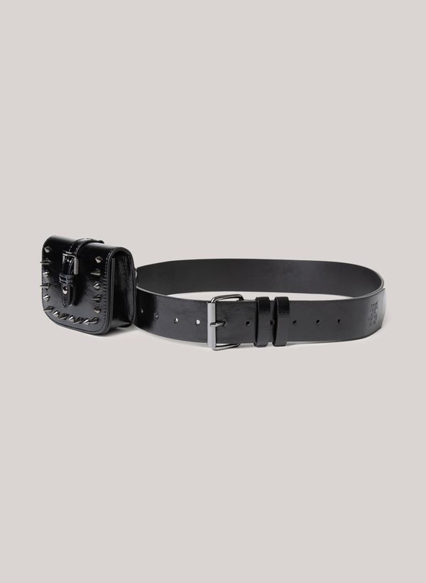 Confeccionado em material sintético, o Cinto possui passantes, fivela metalizada, expessura média, mini bag removível por mosquetão com spikes aplicados e fivela e acabamento pespontado.