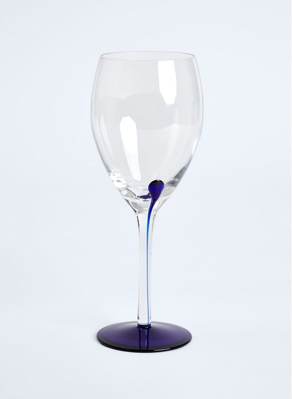 A Taça de Vinho Fortaleza é produzida em vidro translúcido, formato arredondado, superfície lisa com detalhe no fundo da taça em gota azul em alto relevo, que vai até a base da taça, também em azul.