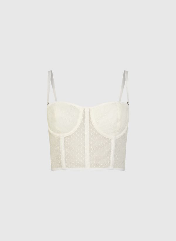 O Top é confeccionado em malha tela arrastão com transparência, possui estampa poa, caimento ajustado, decote coração, alças finas ajustáveis e removíveis, aros aplicados com forro embutido, recortes verticais, fechamento posterior por zíper e acabamento pespontado.
