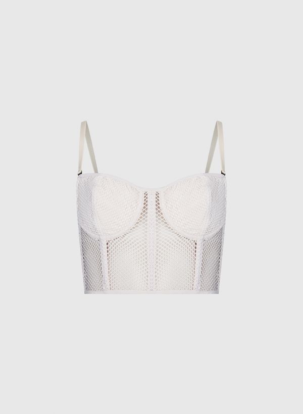 O Top é confeccionado em malha tela arrastão com transparência, possui caimento ajustado, decote coração, alças finas ajustáveis e removíveis, aros aplicados com forro embutido, recortes verticais, fechamento posterior por zíper e acabamento pespontado.