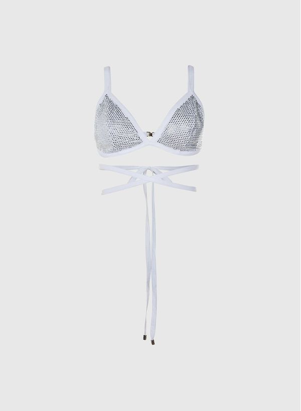 Confeccionado em malha com aplicação de hotfix prateado, o top possui alças finas, decote V, tiras alongadas para fechamento por amarração e acabamento pespontado.