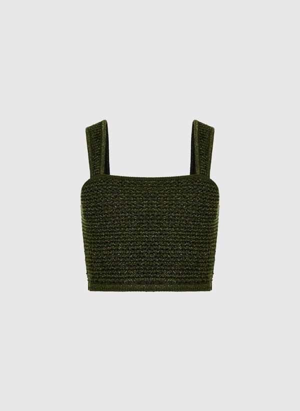 O Top é confeccionado em tricot com fios de lurex, possuialças médias, decote reto, forro interno, comprimento cropped e acabamento canelado.