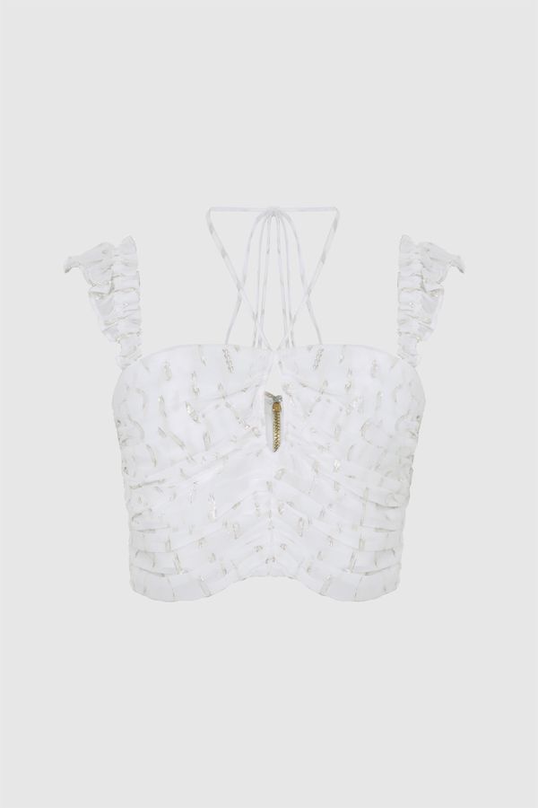 Confeccionado em viscose com aplicação de lurex, o Top possui decote coração com silicone interno para melhor aderência no corpo, detalhe frontal em gota vazado, alças médias franzidas, alças finas para amarração no pescoço, detalhes drapeados, fechamento posterior por zíper e comprimento curto.