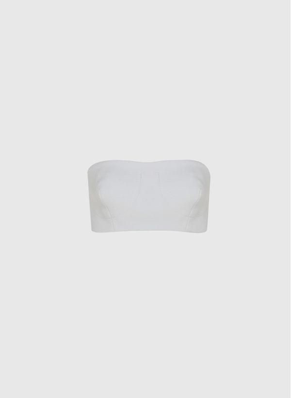 O Top é confeccionado em malha, possui decote tomara que caia, recorte e pences frontais, fechamento posterior por zíper e acabamento interno.