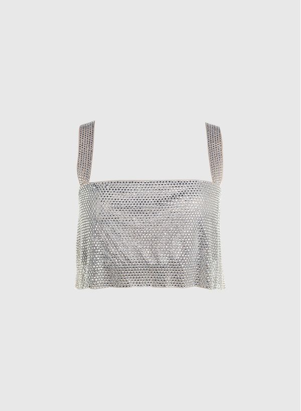 Confeccionado em tule, o Top possui decote reto, aplicação de cristal por toda a peça, alças de gorgurão e forro interno com malha duplo.