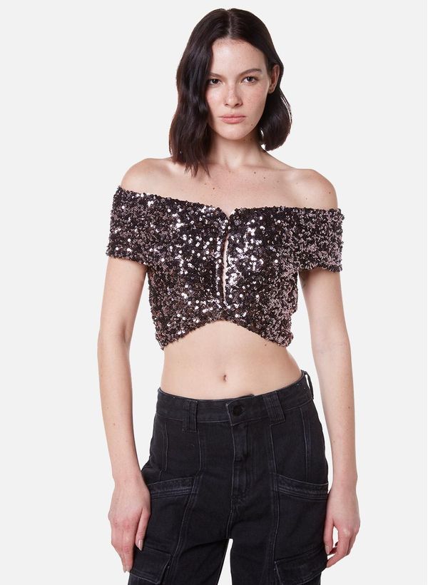 Confeccionado em malha de paetê, o Top possui modelagem ajustada ao corpo, comprimento cropped, decote ombro a ombro com detalhe em “V” frontal e fechamento posterior por zíper metálico.