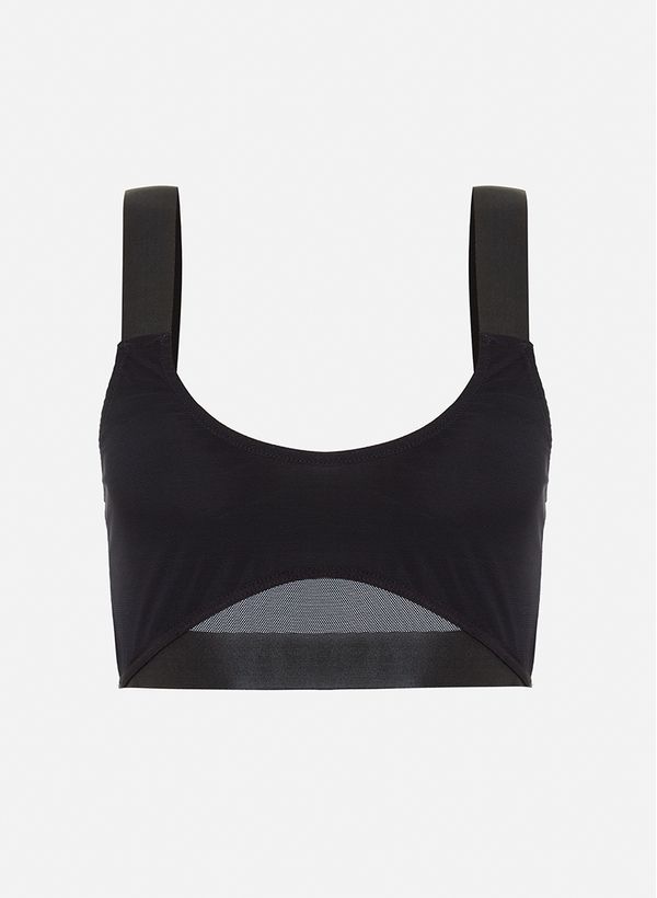 Confeccionado em malha Black, o Top possui modelagem justa ao corpo, detalhe de recorte localizado, transparência e alças em elástico.