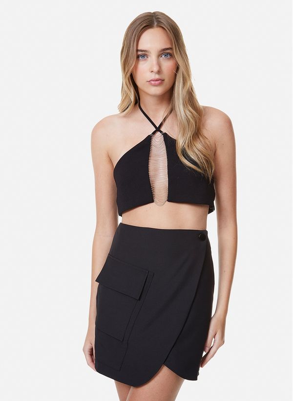 Confeccionado em tecido plano na cor preta, o Top modelagem mais ajustada ao corpo, frente única com amarração possui shape mais solto, frente única com amarração no pescoço, finalizada com ponteiras personalizadas e abertura no decote com detalhe de mini correntes.