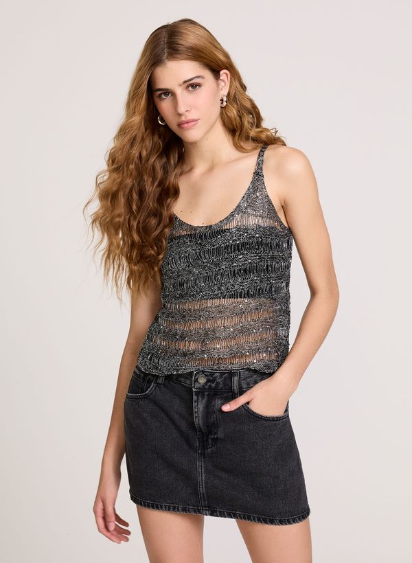 Confeccionado em tricot com paetës aplicados o Top possui modelagem justa, decote arredondado, alças finas e acabamento canelado.