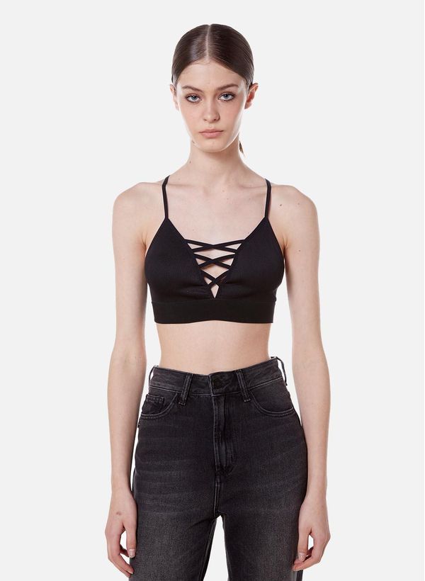 O Top possui modelagem ajustada ao corpo, decote em V com detalhe de alças cruzadas, alças finas e comprimento curto.