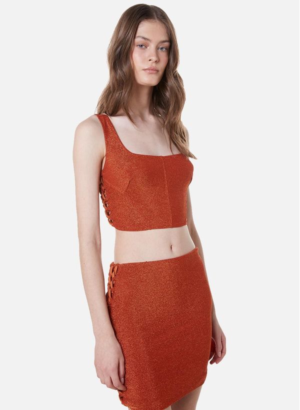 Confeccionado em malha com lurex, o Top possui modelagem ajustada ao corpo, comprimento cropped, alças, decote arredondado, lateral aberta com detalhe em corrente e fechamento posterior por zíper metálico.