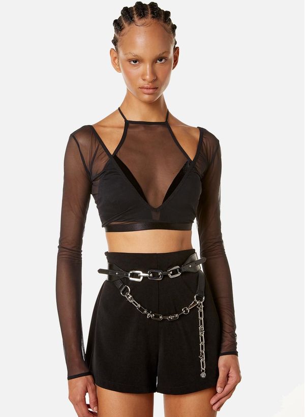 Confeccionada em malha de tule em transparência com veludo, o Top possui modelagem justa ao corpo, mangas longas, frente única e decote aberto em sobreposição, alças finas e aplicação de elástico para melhor acabamento e conforto.