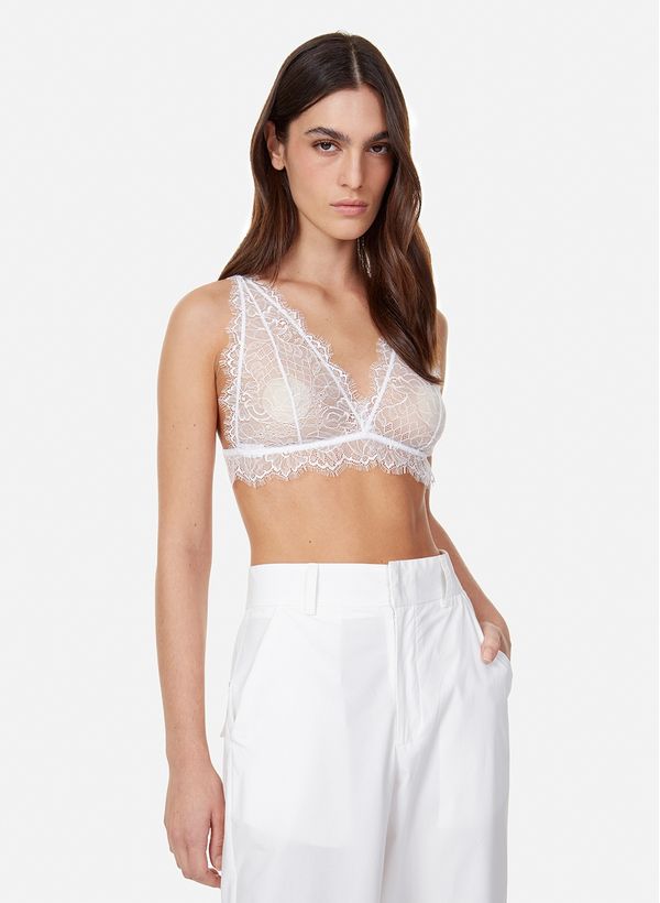Confeccionado em renda, o Top possui modelagem mais justa ao corpo, tipo “bralette”, alças médias e decote aberto.