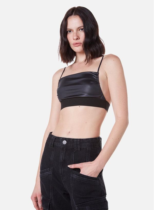 Confeccionado em tecido sintético, o Top possui modelagem justa ao corpo, decote reto, alças finas, leve brilho e acabamento pespontado.