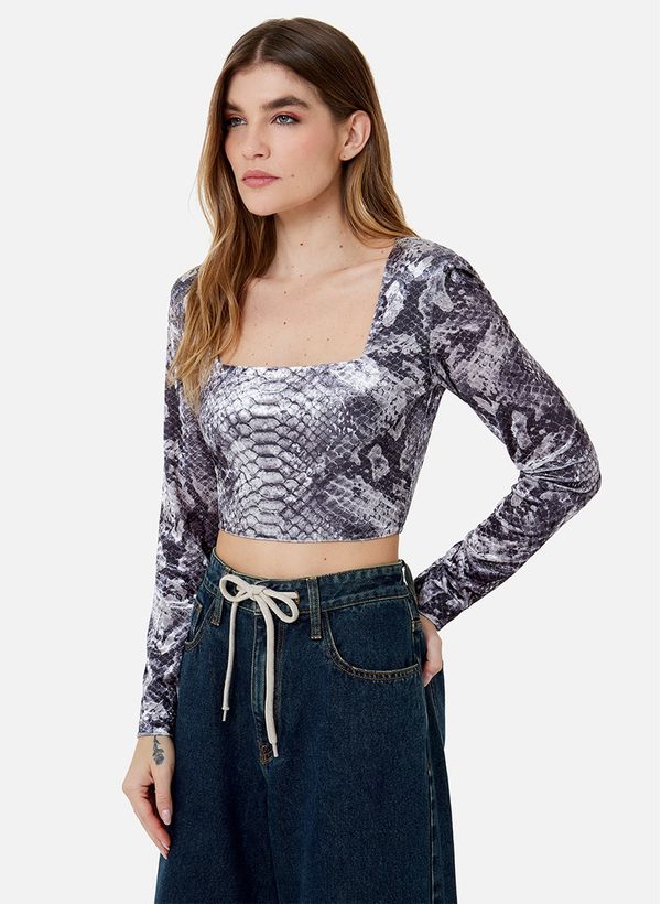 Confeccionado em malha black, o top possui modelagem justa, comprimento cropped, decote quadrado, mangas longas, ombreiras aplicadas e zíper invisível nas costas.