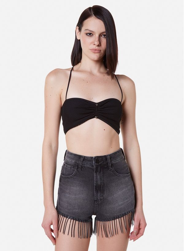 Confeccionado em tecido sintético, o Top possui modelagem ajustada ao corpo, decote coração, alças finas que se cruzam, detalhe de tela aplicada na parte posterior e comprimento curto.