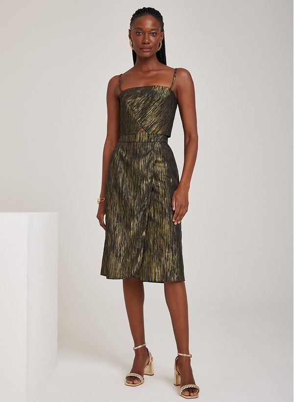 O Top é confeccionado em tecido plano com fios de lurex e efeito dourado, possui decote reto, alças finas, recorte na barra e fechamento posterior por zíper.