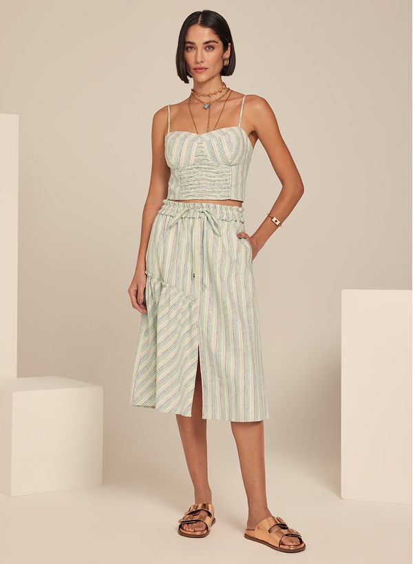 O Top é confeccionado em tecido plano com toque de linho, possui padronagem listrada, decote coração, alças finas, detalhes franzidos, fechamento posterior por zíper e acabamento pespontado.