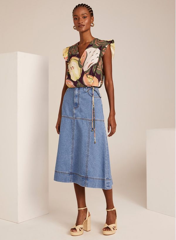 O top de tecido plano é peça curinga para compor a produção com praticidade e estilo. Combine com brinco dourado, saia jeans midi e finalize com sandália de salto. O resultado é um visual easychic e cheia de charme.