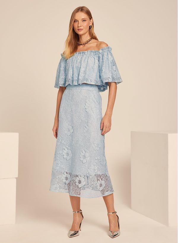 O Top é confeccionado em tecido plano com renda, possui modelo off shoulder, mangas curtas e acabamento pespontado.