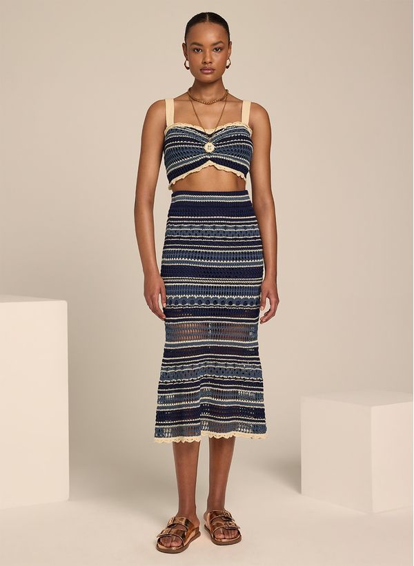 O Top é confeccionado em tricot, possui padronagem listrada, alças finas, decote coração e ponto rendado.