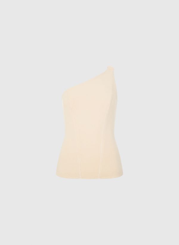 O Top é confeccionada em malha, possui caimento ajustado ao corpo, decote assimétrico com detalhe franzido e acabamento pespontado.