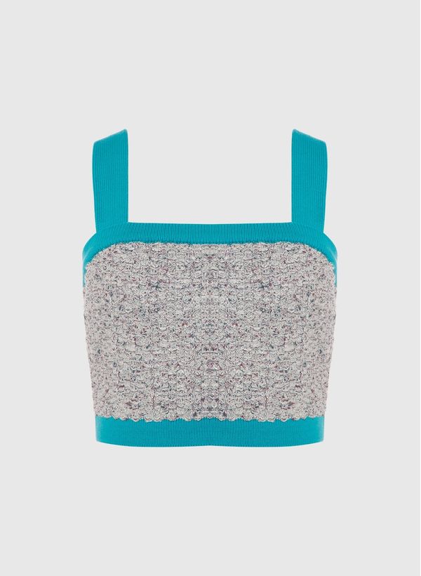 O Top é confeccionado em tricot com efeito mesclado e fios metalizados, possui decote reto, alças médias e acabamento canelado em tom contrastante.