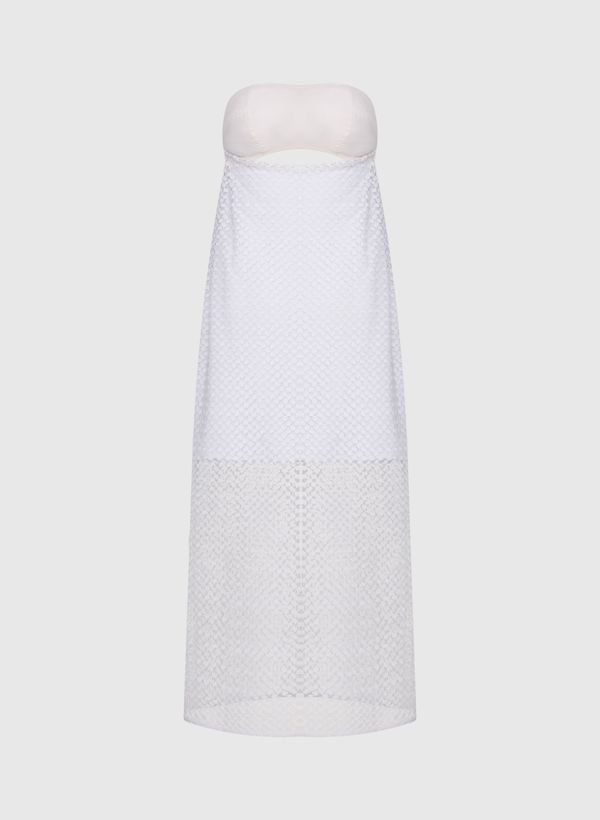 Confeccionado em tule bordado com detalhe em crepe, o Vestido possui caimento reto, leve transparência, modelo sem alças, busto com silicone aderente interno, detalhe frontal vazado, fechamento posterior por zíper invisível, barra com fenda posterior, forro interno, comprimento midi e acabamento pespontado.