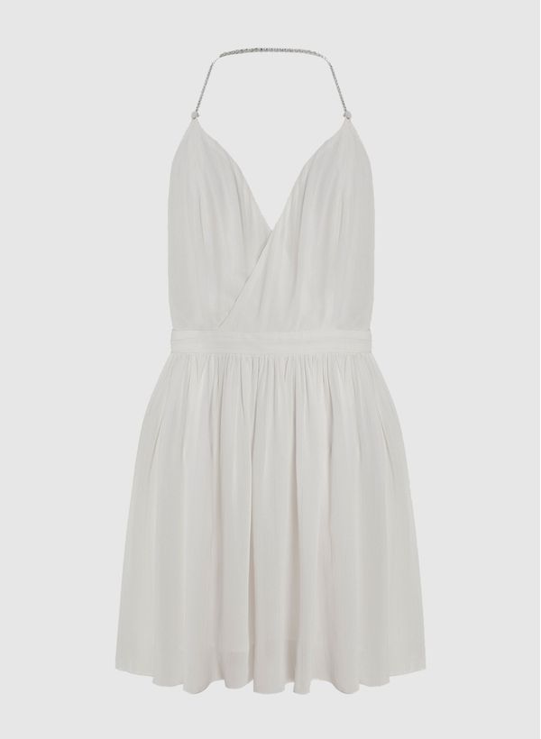 Confeccionado em tecido plano, o Vestido possui modelagem evasê, caimento acinturado, alças finas, decote V, franzidos na altura da cintura, fechamento posterior por zíper, comprimento curto e acabamento pespontado.
