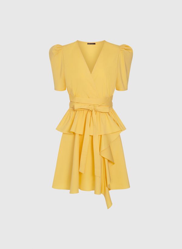O Vestido é confeccionado em tricoline, possui modelagem evasê, caimento acinturado, ombros com detalhes franzidos, mangas curtas bufantes, decote em "V" transpassado, fechamento lateral por zíper invisível, cintura com passantes laterais e detalhes franzidos, detalhe sobreposto com babado lateral em camadas, comprimento curto e acabamento pespontado.