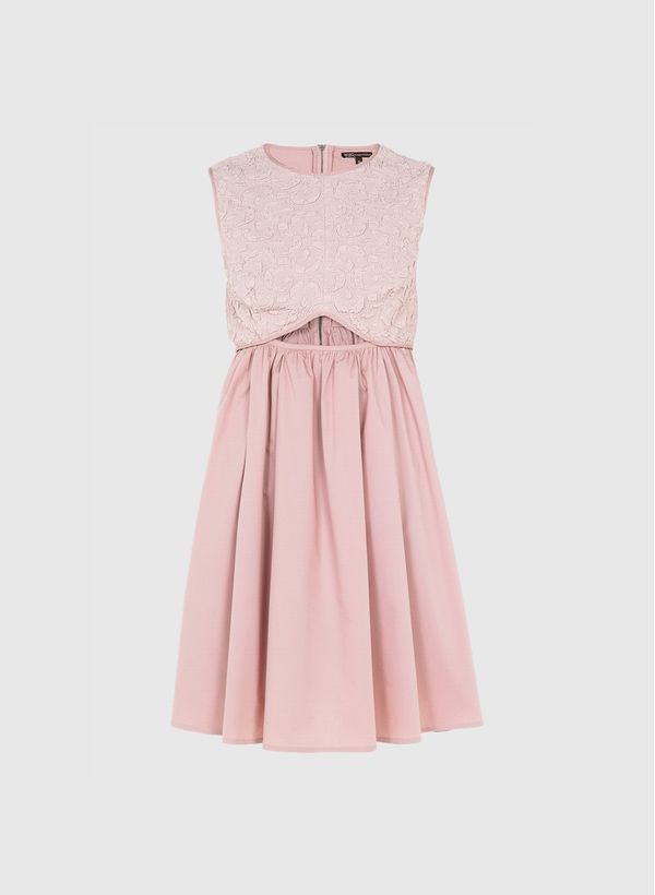 Confeccionado em tecido plano acetinado, o Vestido possui busto texturizado com recorte frontal, alças largas, decote redondo, saia construída em tecido plano com pregas, comprimento mini e acabamento pespontado.