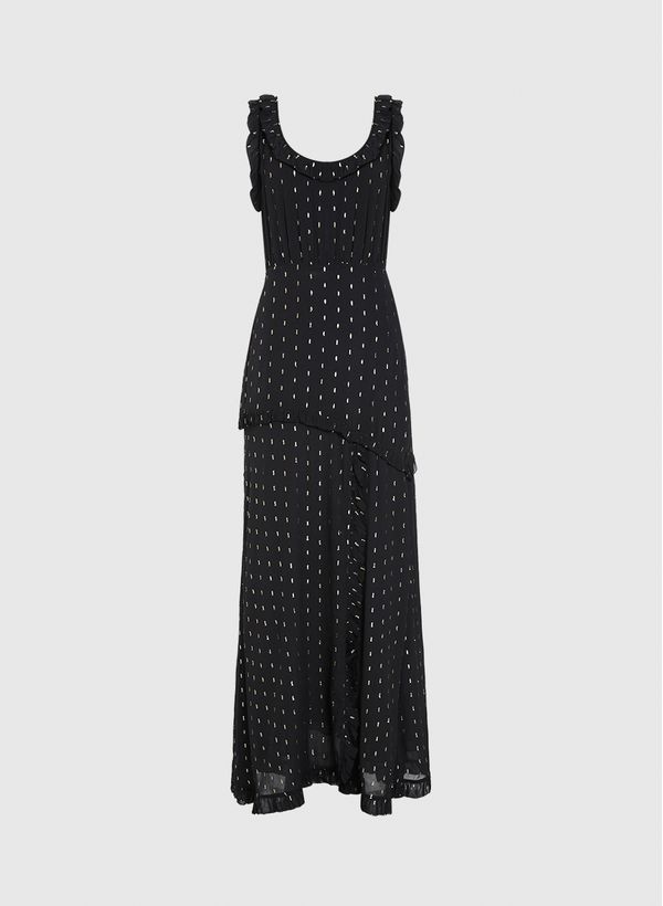 O Vestido é confeccionado em georgette de viscose com aplicações em lurex, possui modelagem evasê, decote em "U" e alças médias com babados, fechamento lateral por zíper invisível, detalhes de babados na saia, fenda frontal, comprimento longo e acabamento pespontado.