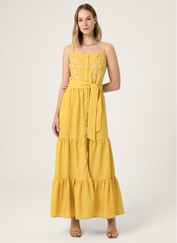 Confeccionado em tecido plano, o Vestido possui modelagem Special Fit, alças finas, bordados florais aplicados no busto, fechamento frontal por botões, bolsos embutidos, e faixa de tecido para amarração.