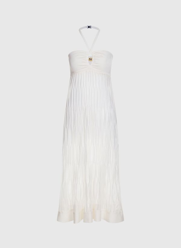 O Vestido é confeccionado em tricot, possui caimento reto, leve transparência, decote com detalhe vazado e aplicação metálica, alças finas transpassadas com fechamento posterior no pescoço, barra aplicada, comprimento midi e acabamento canelado.