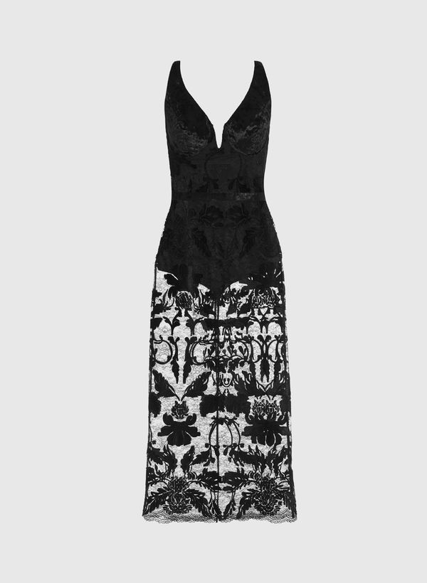 O Vestido é confeccionado em veludo com efeito molhado e renda rebordada, possui caimento evasê, decote em "V" com aro, alças médias, transparência na saia, fechamento posterior por zíper invisível, comprimento midi e acabamento do barrado do próprio tecido.