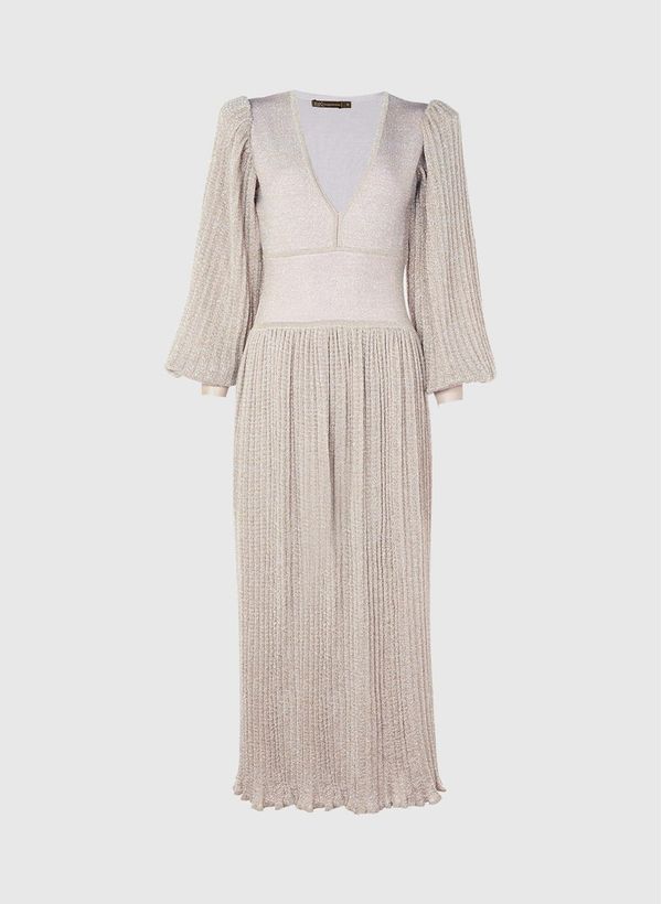 Confeccionado em tricot plissado, o Vestido possui caimento acinturado, aplicação de lurex, decote V, mangas longas levemente bufantes, comprimento midi e acabamento pespontado.
