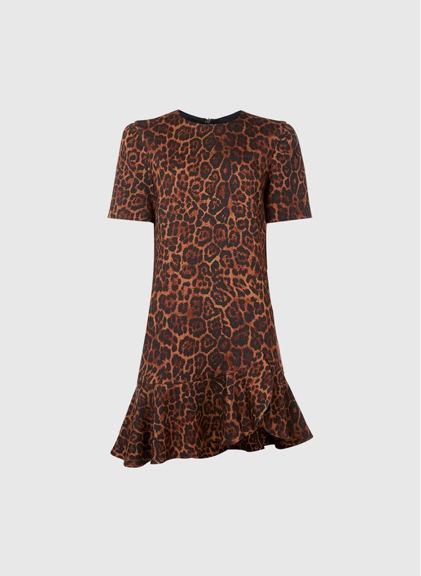 Confeccionado em malha, o Vestido possui padronagem animal print, gola redonda, mangas curtas, fechamento posterior por zíper, barra com babados, mini fenda e comprimento curto.