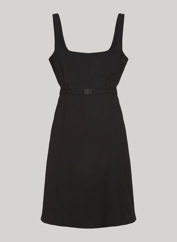evasê , decote reto, alças médias, cinto aplicado abaixo do busto, detalhes de recortes nas costas, fechamento posterior por zíper e acabamento pespontado.
