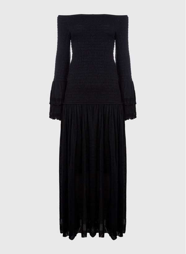 Confeccionado em tricot, o Vestido possui decote ombro a ombro, mangas longas com punhos bufantes, forro embutido e comprimento midi.