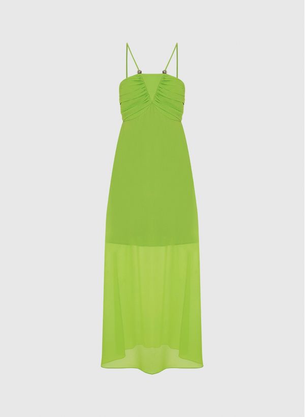 O Vestido é confeccionado em georgette de viscose, possui modelagem reta, caimento acinturado, alças finas com aplicações metálicas, decote reto, busto com detalhes franzidos, fechamento posterior por amarração, detalhe vazado posterior, forro interno, comprimento midi e acabamento pespontado.