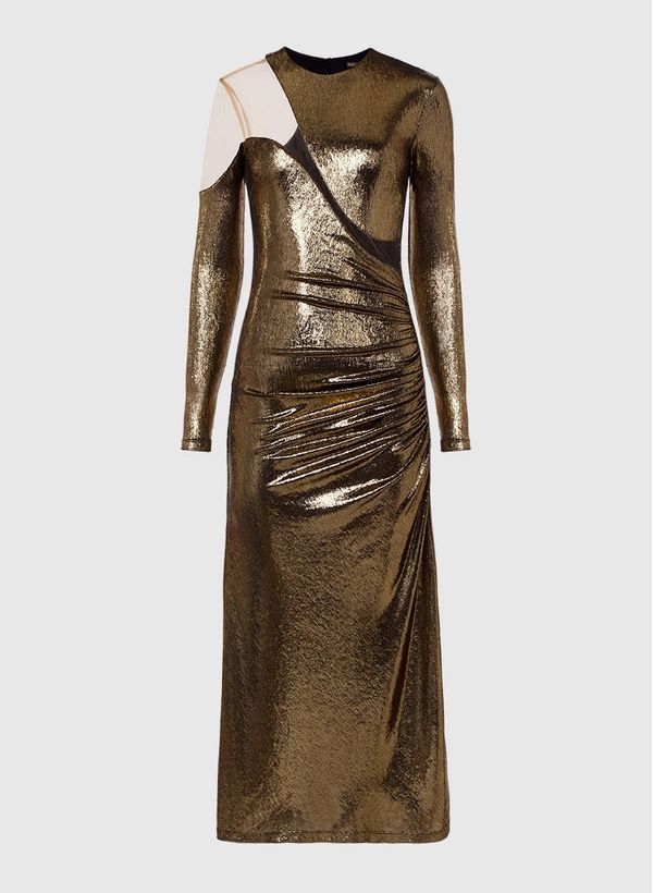 Confeccionado em malha, o Vestido possui recorte assimétrico em tule com transparência, gola redonda, mangas longas, franzido unilateral, fechamento posterior por zíper e comprimento midi.